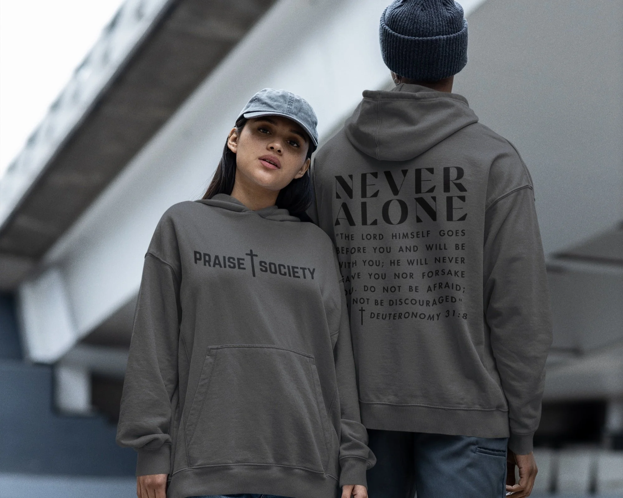 The "NEVER ALONE" Christian Sweatshirt is our inaugural design, inspired directly by the powerful words of Deuteronomy 31:8.